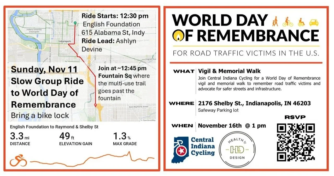 Central Indiana Cycling in partnership with Health By Design and local community organizations will be holding the Indianapolis World Day of Remembrance Vigil Walk on Sunday, November 16 at 1:00 pm to remember those in our community who have been severely injured or lost their lives due to traffic violence. Ahead of the walk, family members and friends of those lost to traffic violence will be invited to speak. We will also invite local leaders to speak about their efforts to reduce crashes and improve road safety in Indy.