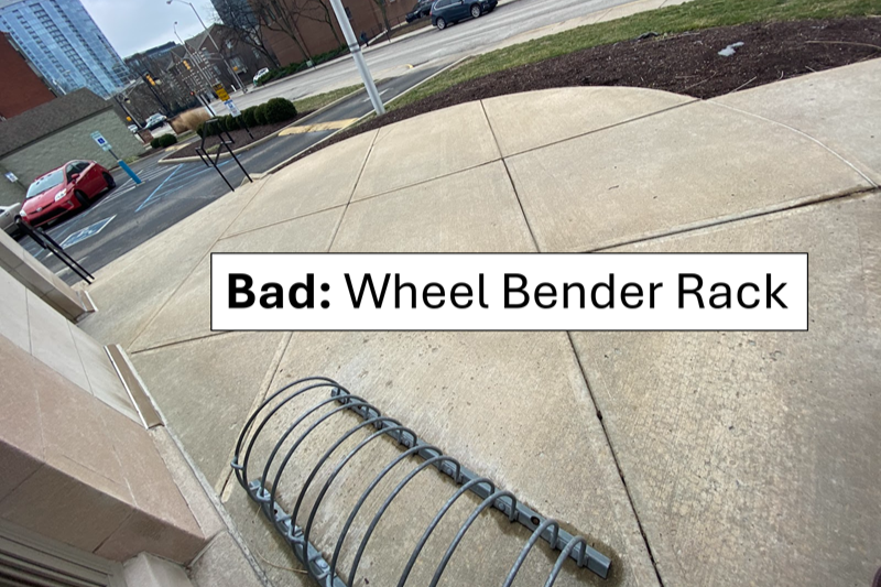 Poorly designed racks—like wheel-benders or wave / spiral designs frustrate riders, leave bikes vulnerable to theft, and sometimes damage bikes.