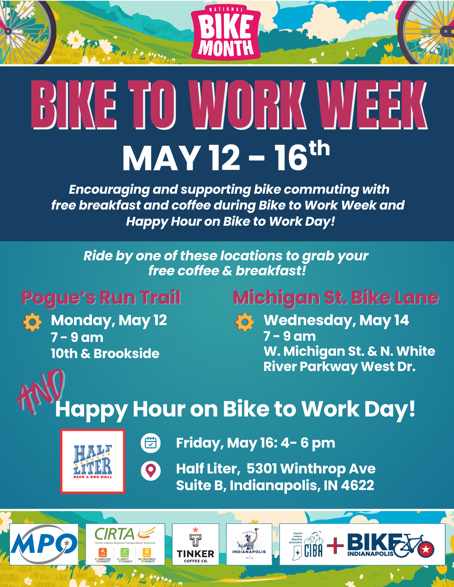 National Bike to Work Week promotes the bicycle as an option for commuting to work. CIBA-Bike Indianapolis, in collaboration with CIRTA/Commuter Connect, IMPO and the City of Indianapolis, is hosting this event to highlight our multi-use trails that are available for commuting, the benefits of alternative transportation and the overall benefits and joy of cycling. We are providing free coffee and breakfast on the trails and a happy hour celebration on Friday, May 16 for Bike to Work Day. We encourage you to ride your bike to work and hope to see you at one of these events: